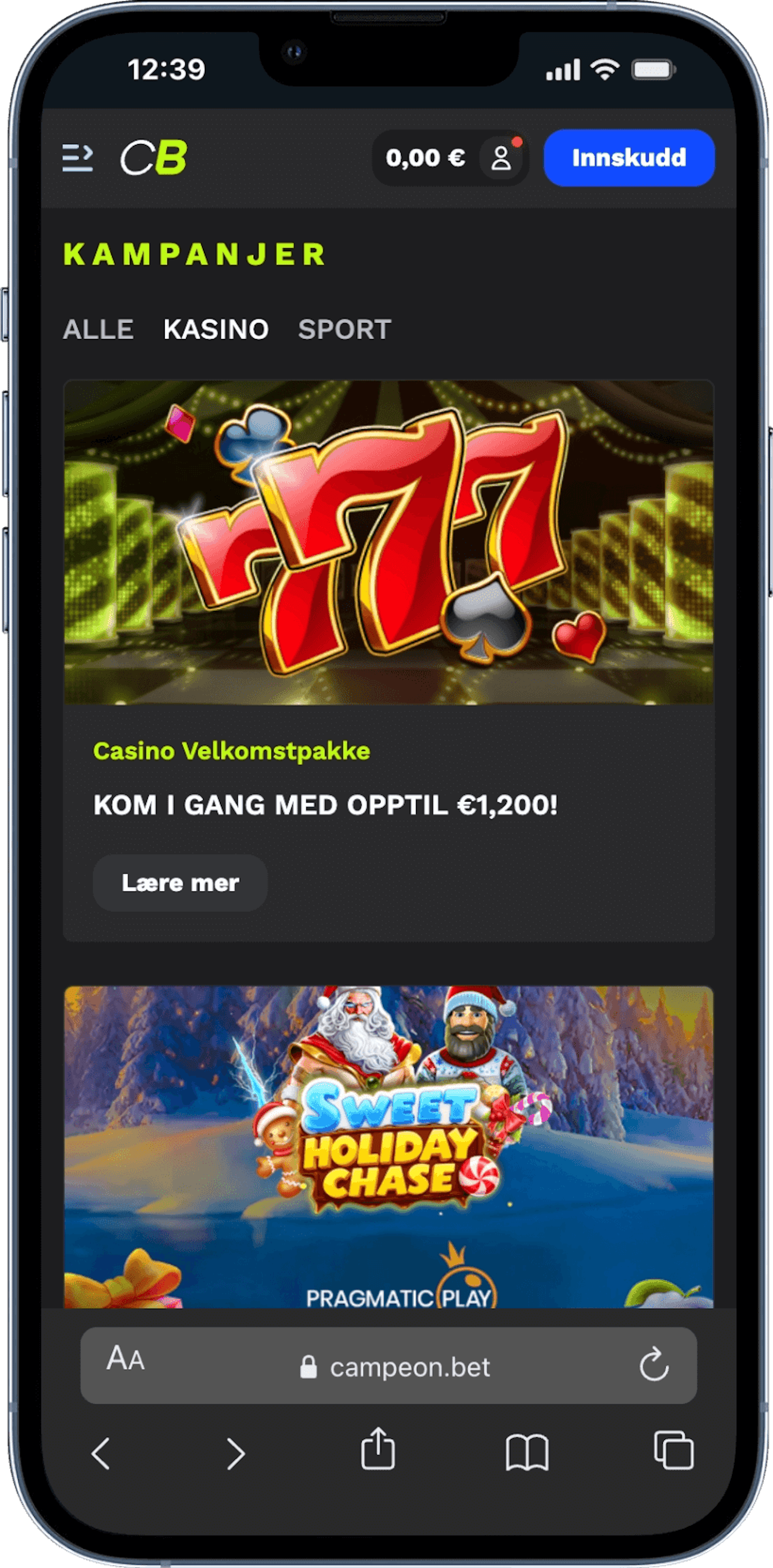 Campeon.bet tilbyr en 3-delt casino velkomstpakke på opptil €1 200, fordelt på de tre første innskuddene. Alle tre casino bonusene har et omsetningskrav på 30x innskudd + bonus, og gjelder hovedsakelig spilleautomater, som også bidrar 100 % til omsetningen. Minimumsinnskudd er €25 per bonus, og det gjelder innsatsbegrensninger mens bonusen er aktiv. Bonusstrukturen er ryddig og tydelig, men vilkårene er relativt strenge og passer best for spillere som er komfortable med tradisjonelle omsetningskrav.