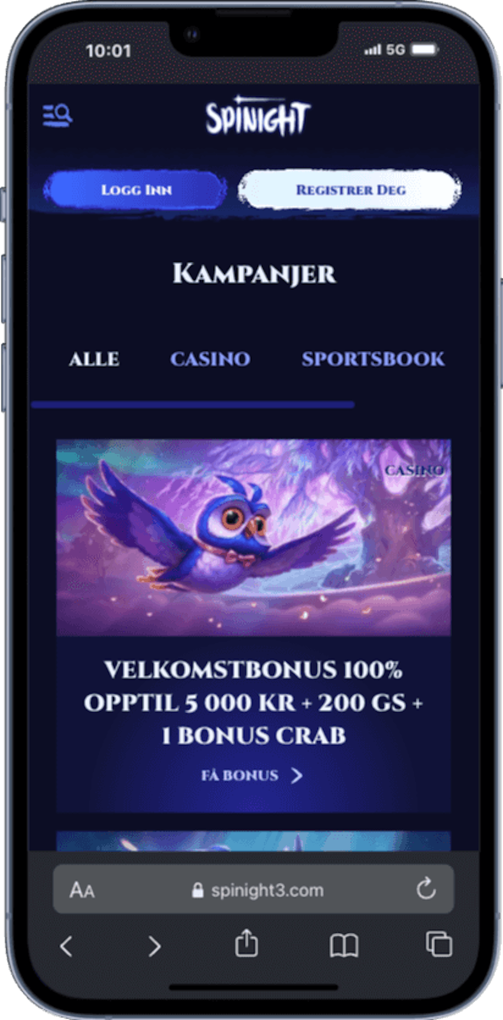 Spinight er et nytt nettcasino som kan skryte av et stort casinoavdeling. Det finnes også mange interessante kampanjer, turneringer og utfordringer, i tillegg til Bonus Crab og VIP avdeling. Spinight har dessverre ingen EU-lisens, men tilbyr mange betalingmetoder og nettsiden på norsk.